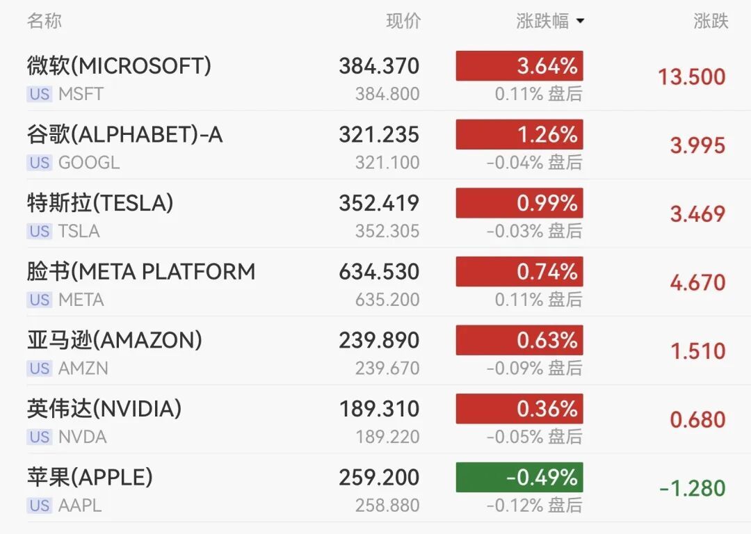 龙头科技股普遍上涨。微软收涨3.64%,谷歌涨1.25%,特斯拉涨0.98%,Meta涨0.74%,亚马逊涨0.63%,英伟达涨0.36%,奈飞涨0.15%。