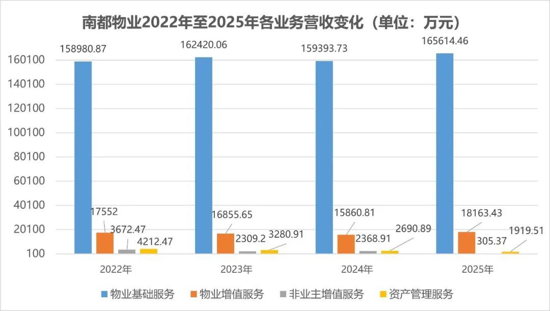 主要靠收入基础更大的物业基础服务拉动增长,南都物业近年来在受到房地产行业影响较大的非业主增值服务及资产管理服务业务上持续承压。