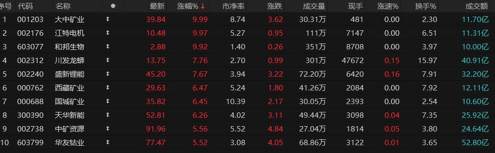锂矿概念持续走强,大中矿业、江特电机涨停。